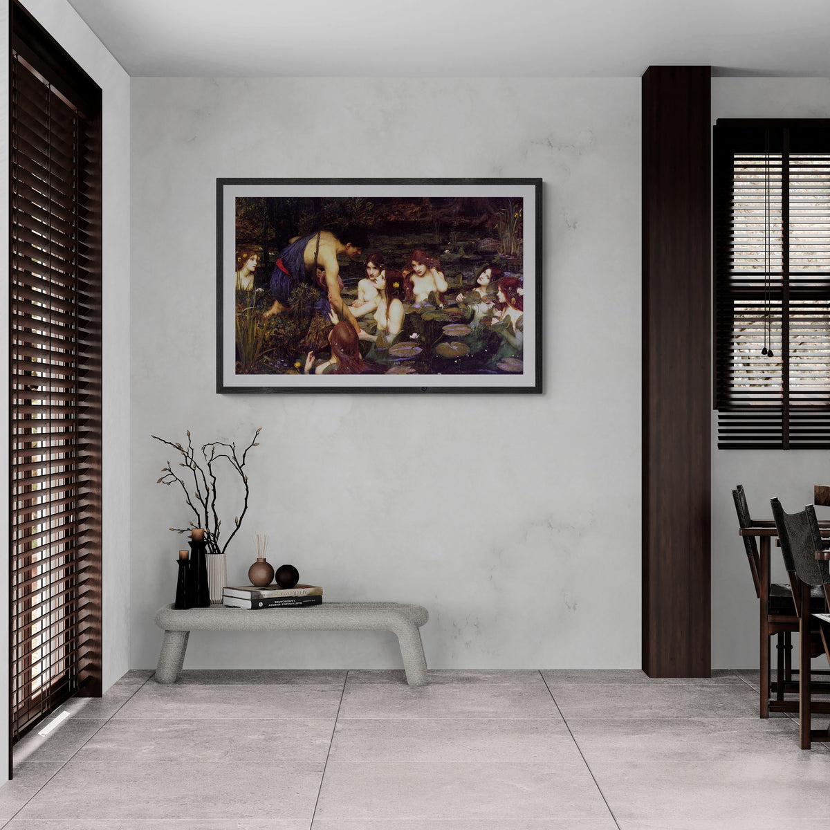 Bring the allure of ancient mythology into your home with this premium reproduction art print of Hylas and the Nymphs by John William Waterhouse. Immerse yourself in the magical world where Hylas, the handsome youth, encounters the seductive nymphs by the water's edge. The rich colors and intricate details of this masterpiece come to life on both canvas and art paper. Perfect for art lovers, collectors, or anyone seeking a touch of myth and beauty.