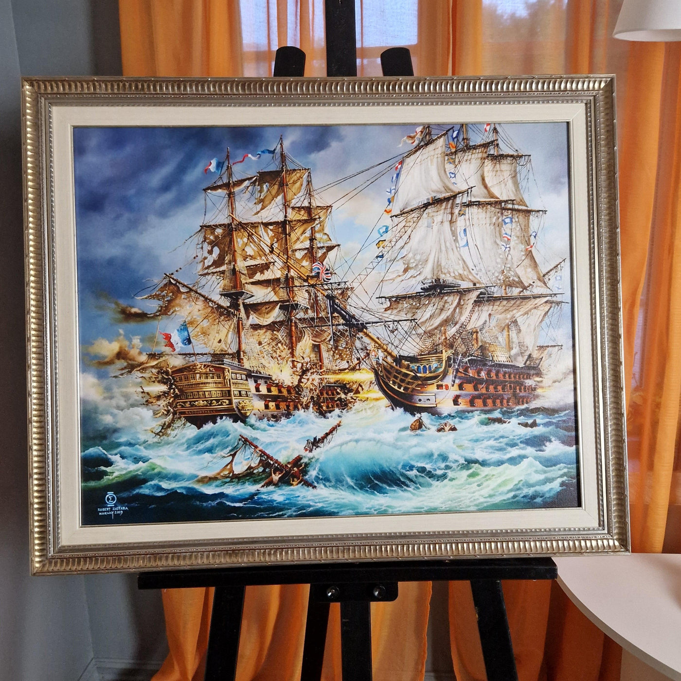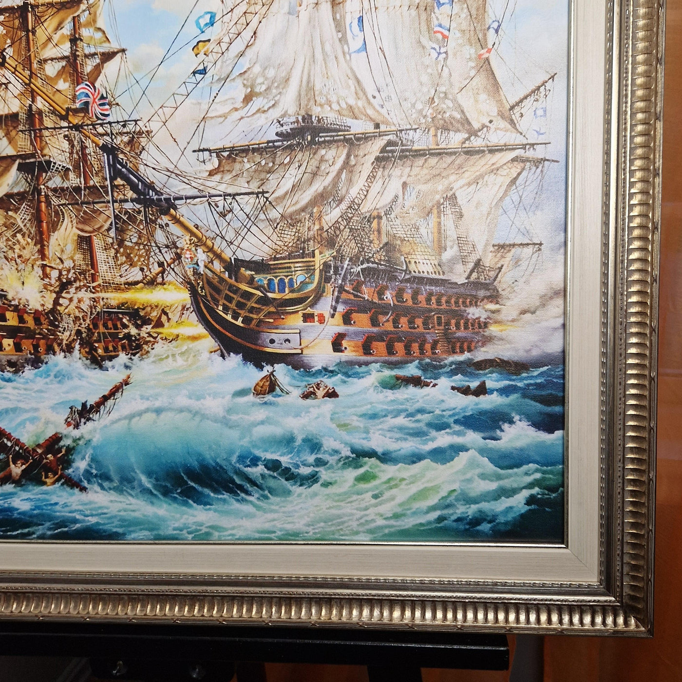 BESKRIVELSE - Et havpanorama av den berømte "Battle of Trafalgar" laget på et lerret strukket på en ramme. Dette oljemaleriet er basert på omfattende historisk og nautisk forskning av gamle kart, trykk og fotografier samt hans bakgrunnskunnskap om skipene.