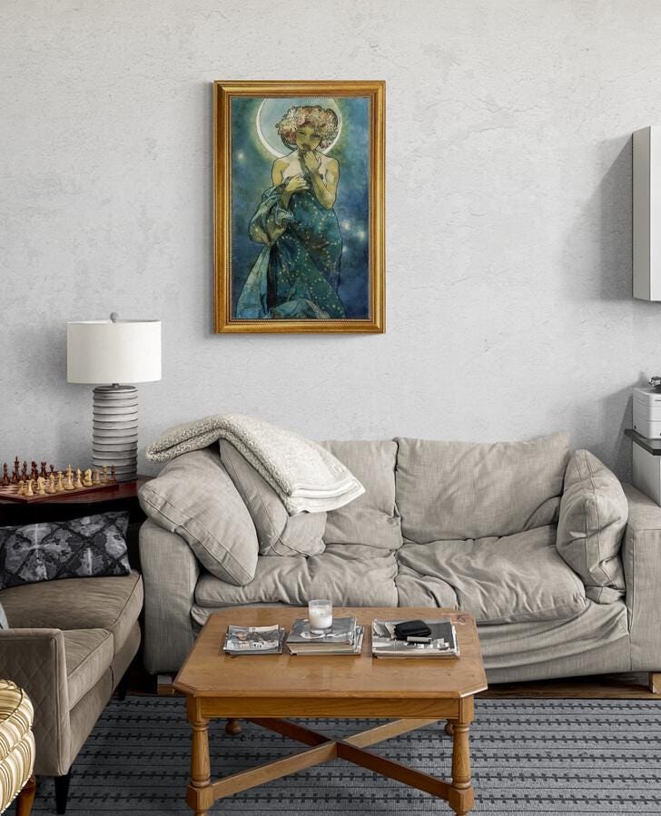 This is an exquisite reproduction of the famous art piece "The Moon & the Stars" created in 1902 by Alphonse Mucha. The picture is delivered with the stunning vintage golden frame that exudes timeless elegance.