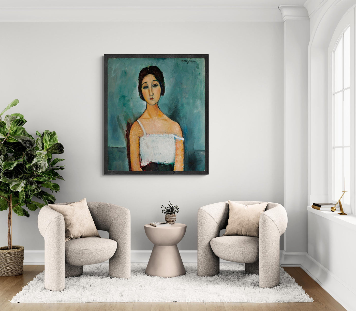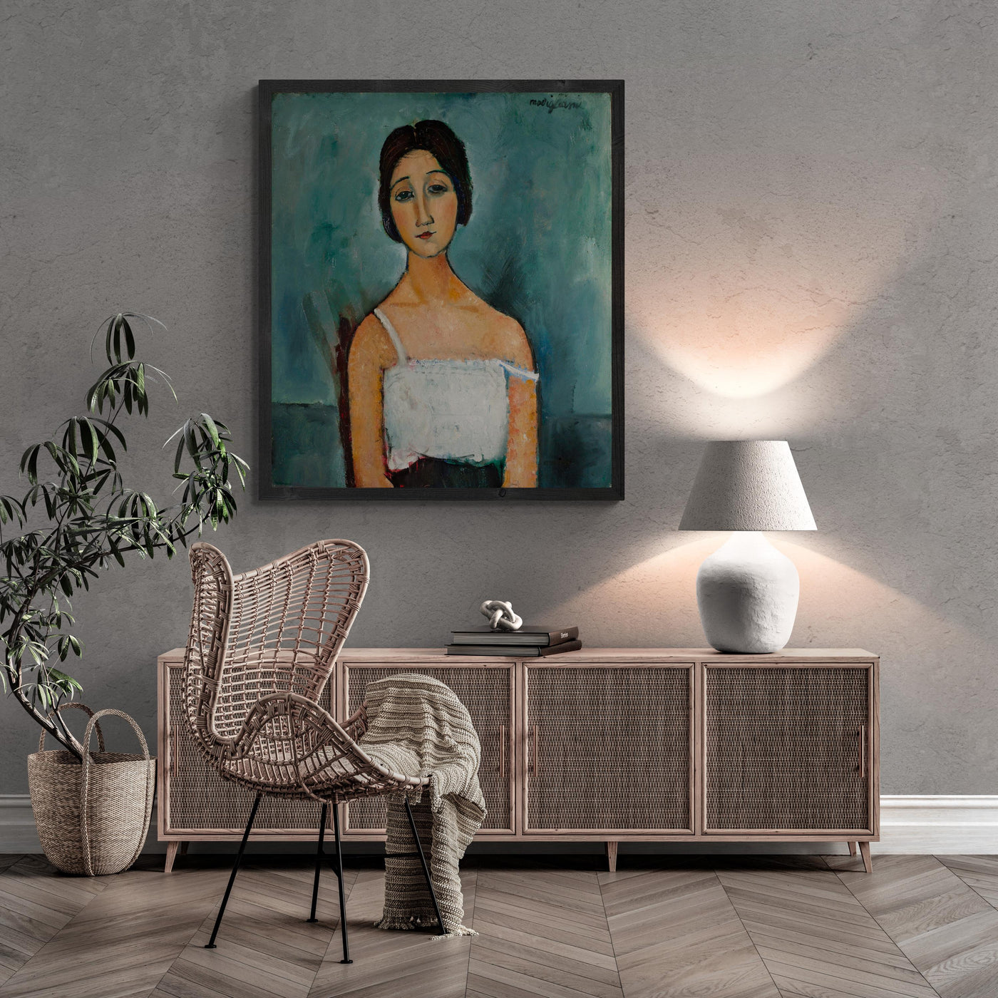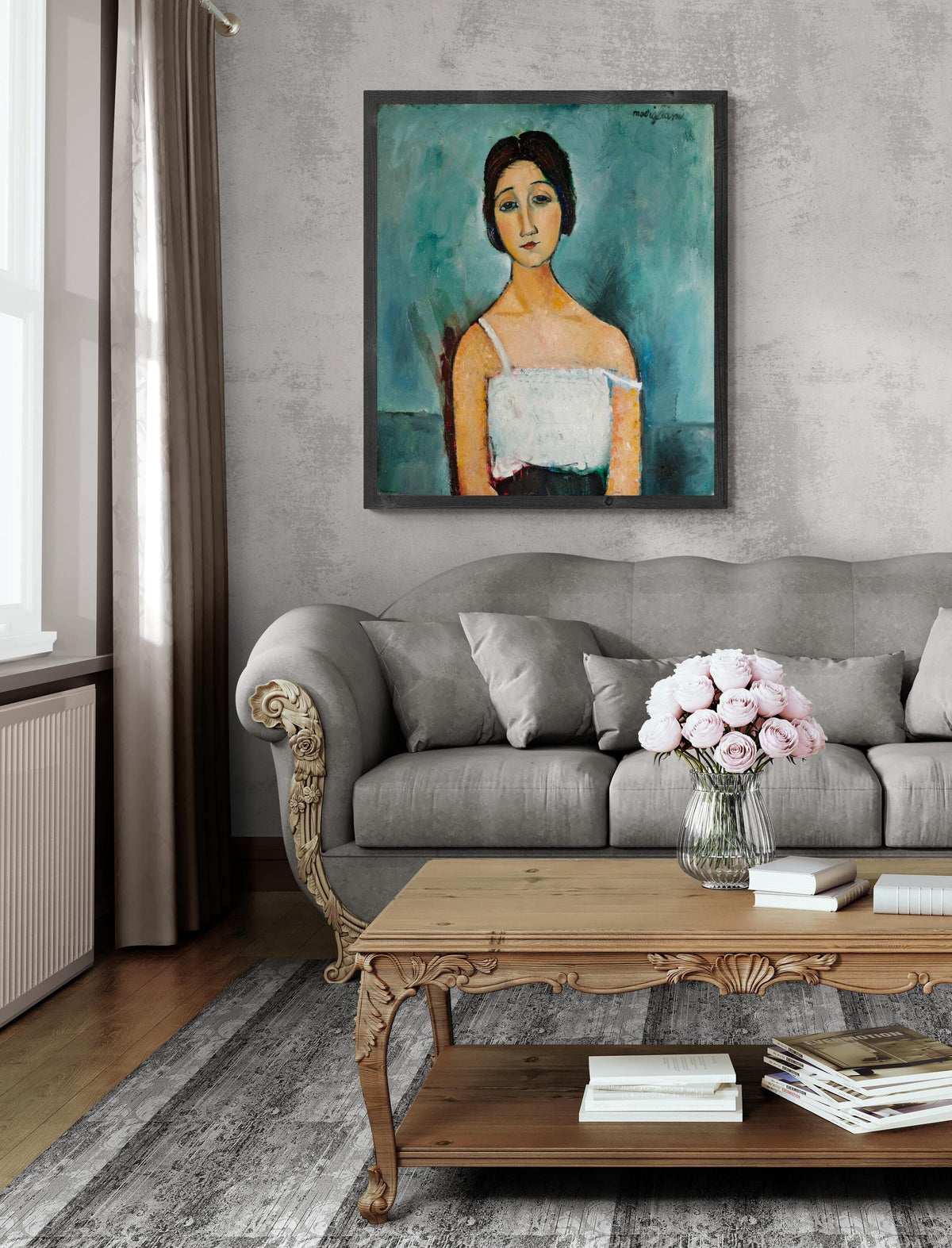 This is an exquisite reproduction of the famous art piece "Christina" created by Amedeo Modigliani.