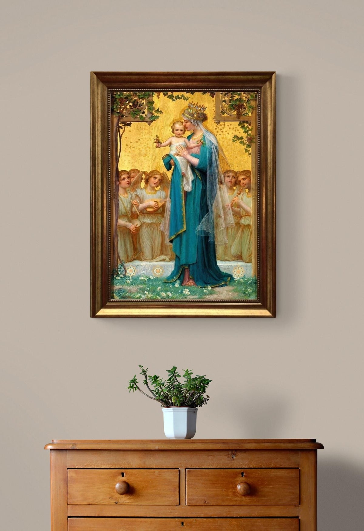 The "Madonna and Child" print by Enrique M. Vidal is a beautiful and evocative piece of religious art. Enrique Monserdà Vidal, a Spanish artist known for his work in painting, decorating, and church restoration, created this piece with a blend of medievalism, orientalism, and neogothic styles.