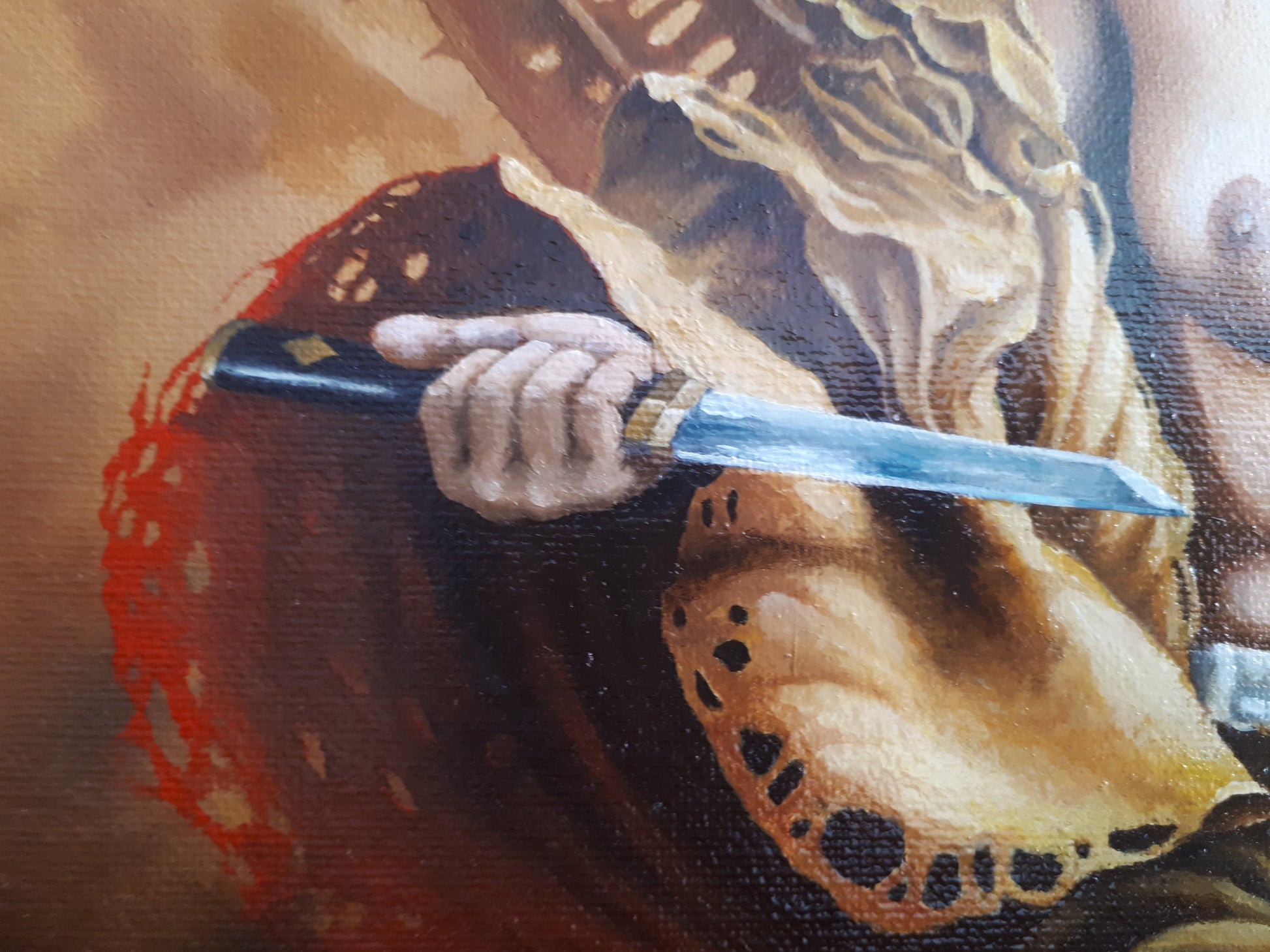 RED THIN LINE painting illustrating a Japanese girl who is just about to commit ritual suicide formally known as seppuku or harakiri. It usually involved cutting the abdomen open with a short sword, which was believed to immediately release the samurai's spirit to the after life. Seppuku was not only reserved for man. Women of the samurai class often committed seppuku if their husbands died in battle or were forced to kill themselves. Women would first bind their legs together with a silk cloth to prevent an unseemly posture after death.
