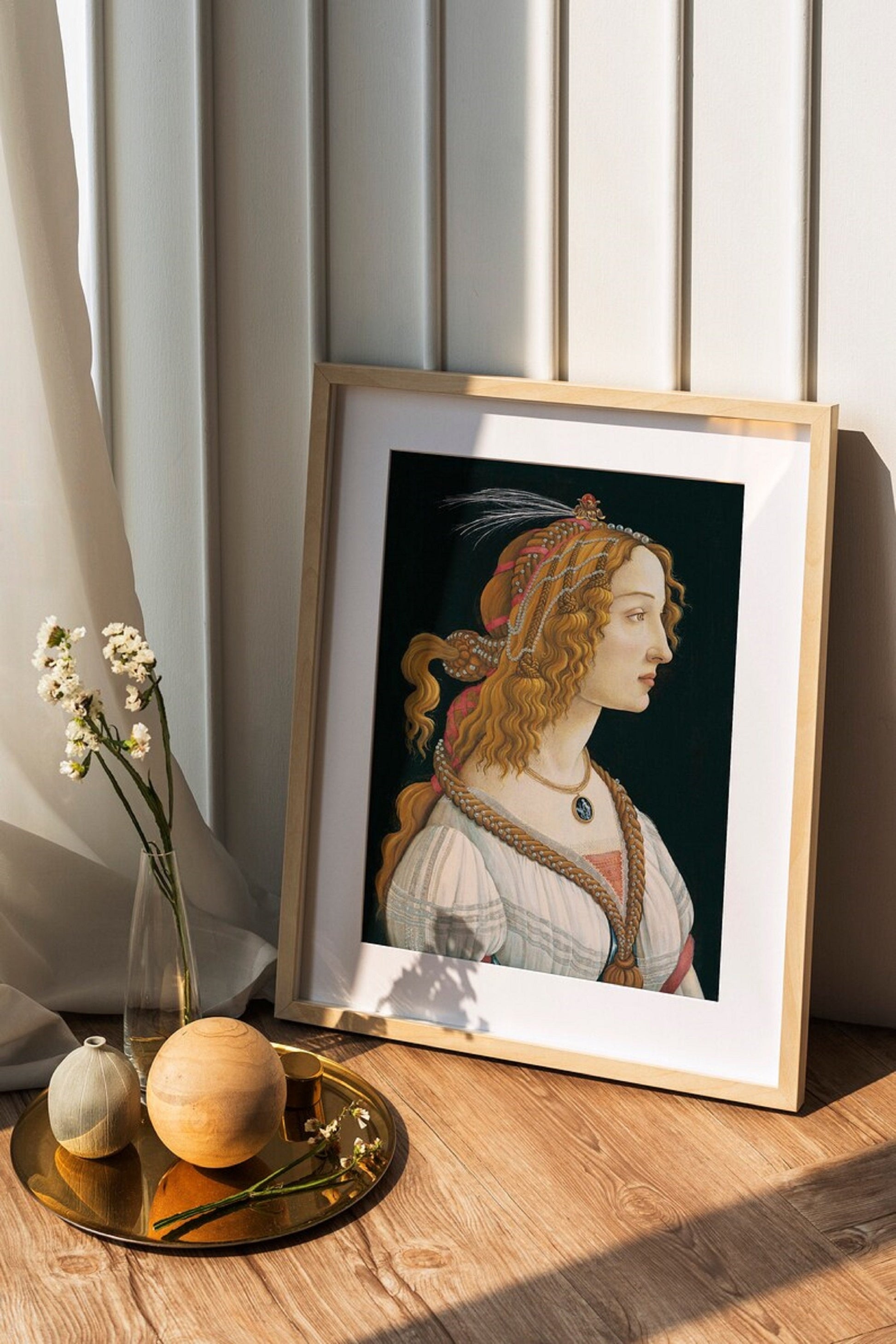 This is an exquisite reproduction of the famous art piece "Portrait of young woman" created in 1480-85 by Sandro Botticelli.