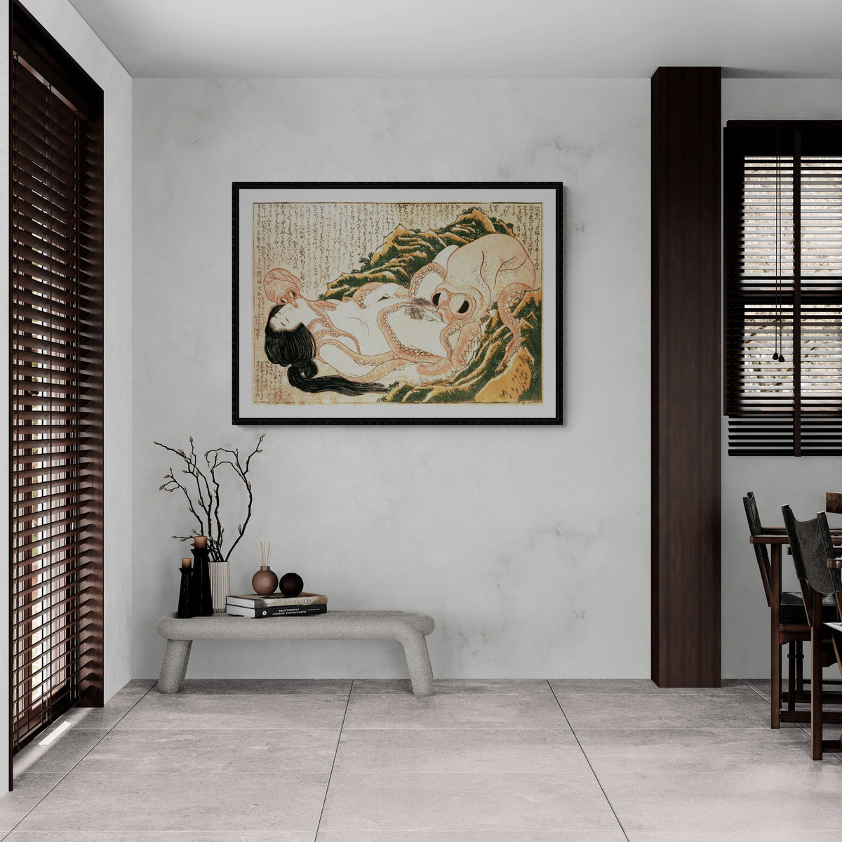 Immerse yourself in the mesmerizing world of Japanese art with our premium reproduction of Katsushika Hokusai's The Dream of the Fisherman's Wife. This exquisite canvas print captures the sensual allure of the original woodblock design, where a young ama diver shares an intimate connection with two octopuses. The intricate details, rich colors, and lifelike texture make this artwork a true masterpiece.