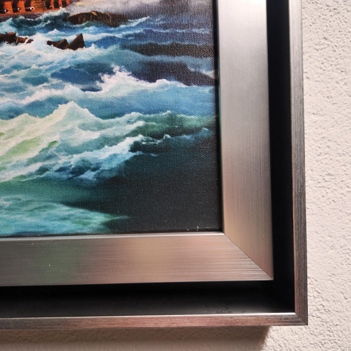 This is a Premium reproduction of my original oil painting "Battle of Trafalgar", painted in 2019. The oil painting is based on the on extensive historical and nautical research of old maps, prints and photographs as well as his background knowledge of the ships. The picture is delivered with the stunning modern silver frame that exudes timeless elegance. The canvas is hand-signed (left corner) by the artist.