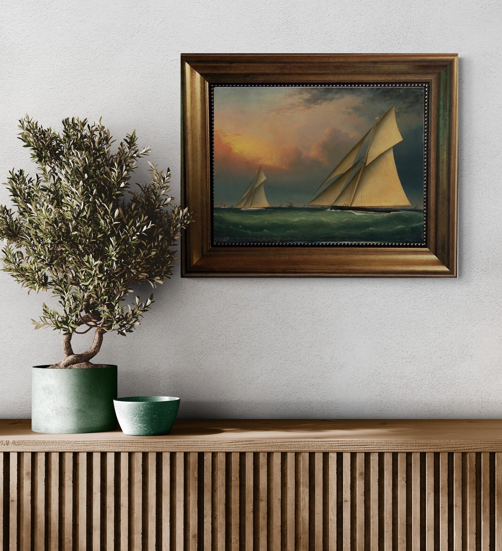 Premium reproduction of the original oil painting America's Cup Defense, 1885 (Puritan and Genesta) byJames Edward Buttersworth.