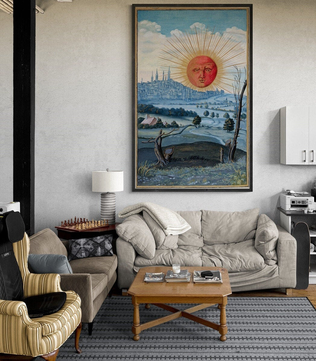 The Sun with human face rising from Splendor Solis by Salomon Trismosin, Art Prints, Experiencing the Mysteries of the Universe Through Art!