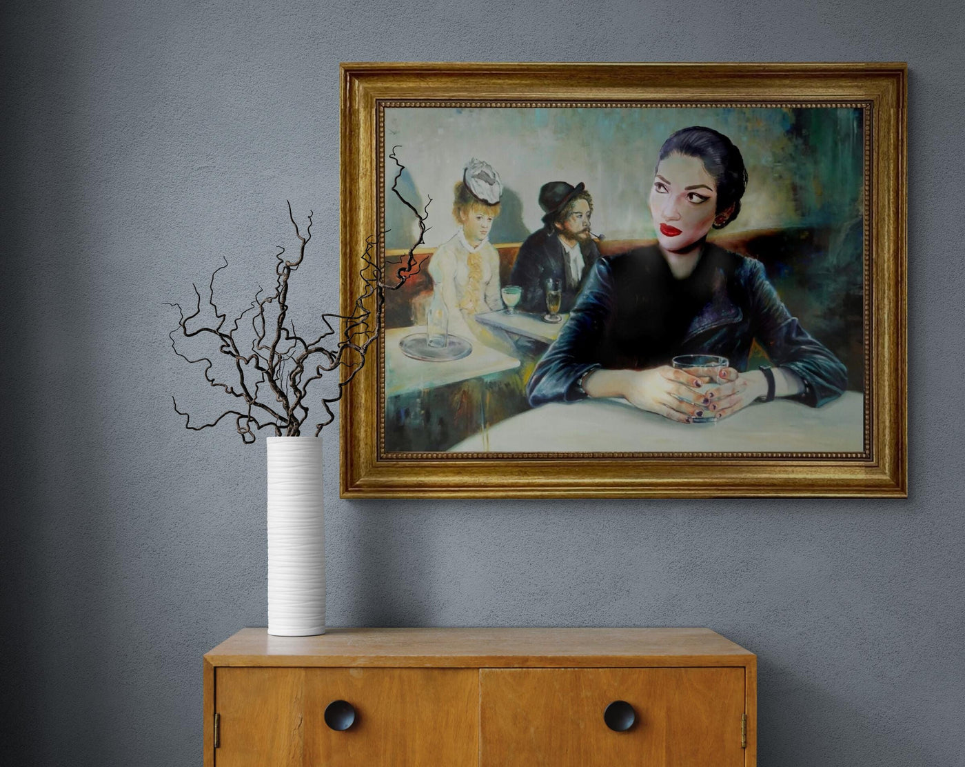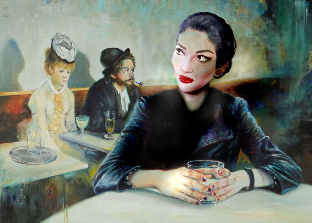 This is a premium reproduction of the famous legendary Opera Diva Maria Callas transformed into the famous painting 'In a Café' by Edgar Degas.